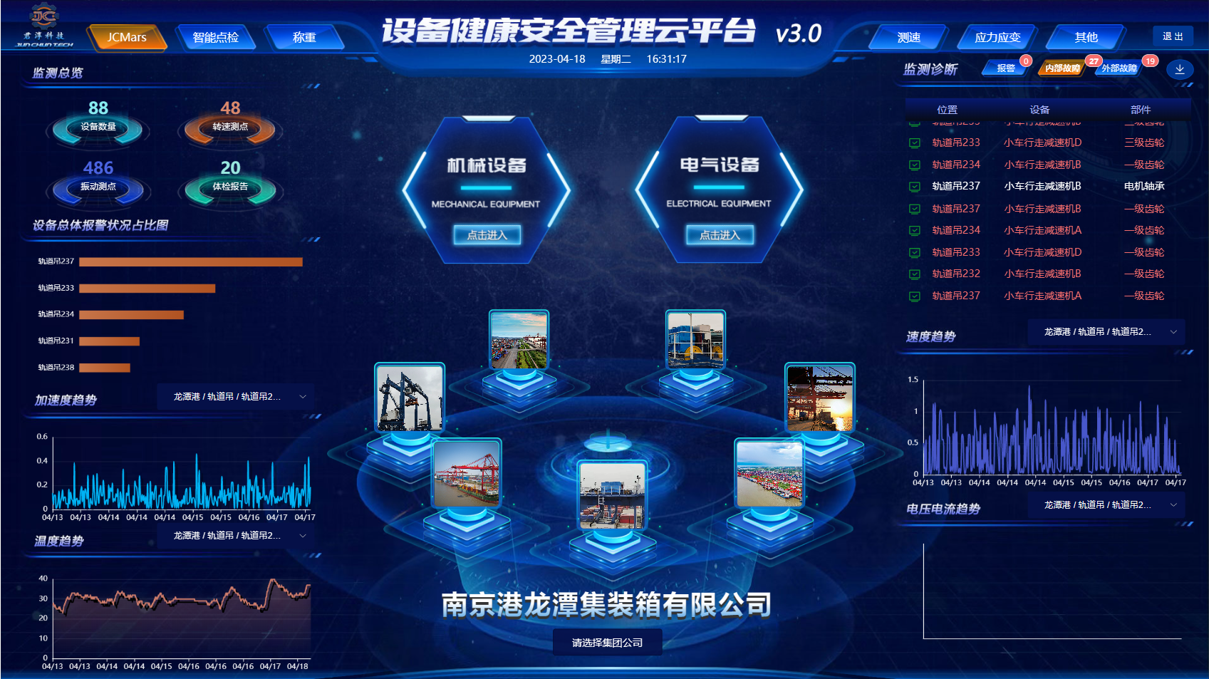 我司开发的《设备健康安全管理云平台V3.0》系统是根据设备检测《JCmars800》系统对现场设备振动、温度、油压、油品、噪音、电流等采集的数据和其它现场应用的设备管理软件等采集的数据,建立大数据分析库。通过对设备零部件的振动劣度、频次和设备频谱图形反映的故障特征等,结合拓展系统相对应的采集数据,利用科学计算概率原理,综合分析判断设备故障原因及寿命预测。